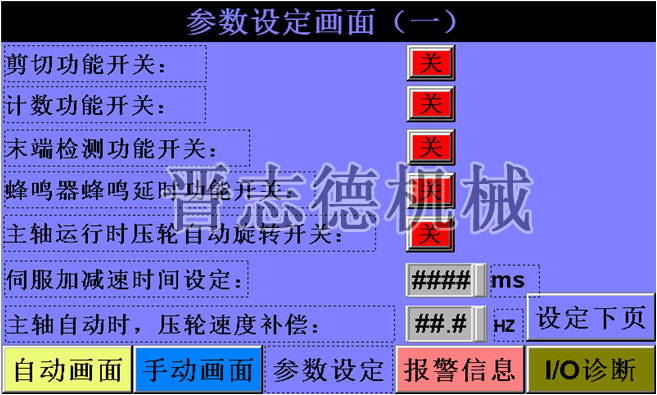 7、“主軸自動時,壓輪速度補償”,自動時,當壓輪速度慢于主軸速度,則補償壓輪速度,該速度需要調試適當。