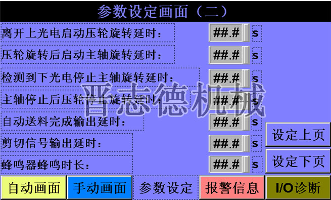 3、“檢測到下光電信號停止主軸旋轉延時”, 三合一送料機材料架部分停止開卷時先停止主軸旋轉后停止壓輪旋轉,該延時設定檢測到料環(huán)下降到停止主軸旋轉的時間。