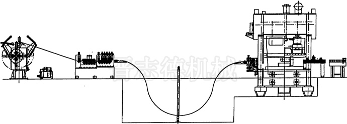 使用時,將整卷的鋼帶通過雙頭材料架的馬達帶動開卷,并通過雙頭材料架上的氣運摩擦裝置使卷料在雙頭材料架和整平機之間形成一定的引力,鋼帶經過整平機中整平后,通過調整托架進入待料坑中進行待料,以供步進送料用,在待料坑中間設有光電感應裝置,檢測鋼帶下垂的位置是否在規定的范圍內,若鋼帶距離上檢測點近,則說明待料少,則通過光電感應裝置反饋PLC控制器信號,PLC控制器輸出控制信號給整平機的交流變頻器,以調整變頻馬達的速度。鋼帶通過伺服NC送料機,在PLC控制器控制下,按著固定的速度、頻率送料,經沖床連續沖壓、切斷,拋料機同步拋料,完成整個工件自動生產過程。