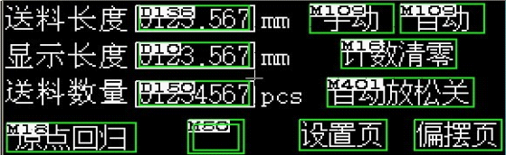 NC偏擺送料機電源開關開啟→電源指示燈亮,夾緊指示燈亮,停止指示燈亮人機介面顯示晉志德公司介面→右下角有主頁開關止時按下主頁開關便會進入如(圖一)主頁
