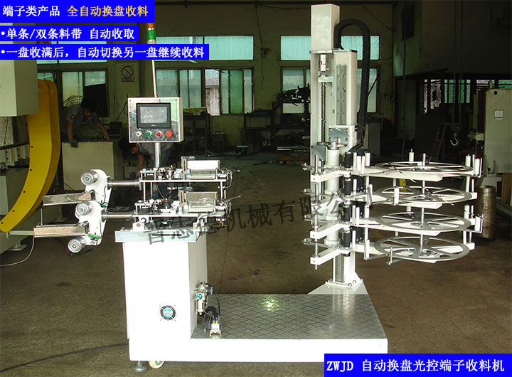 自動換盤端子收料機是專為高速沖床沖壓端子用單條式雙條料帶收取機。屬高端收料設備,其具有性能優越,工作效率高,省時省力等優點。當一盤收滿時,會自動切換到另一盤繼續工作。中間不需停機,是當前先進的自動化收料設備。