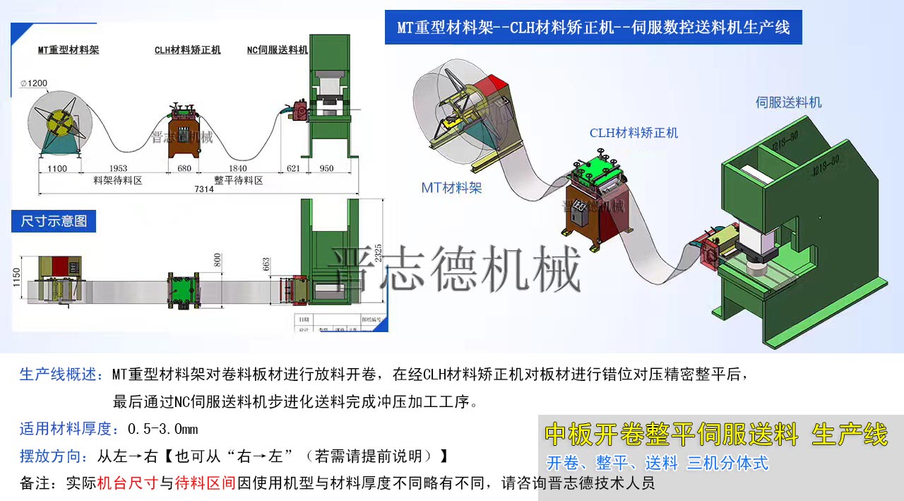 1、材料矯正機適用于0.5-3.0mm厚的中板材料整平,整平滾輪為¢60mm,上3下4排列方式,可用于各五金廠、電子廠沖壓件的連續生產。
